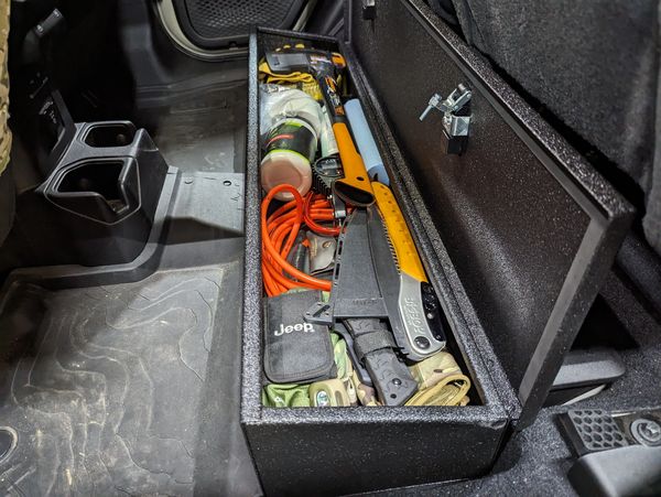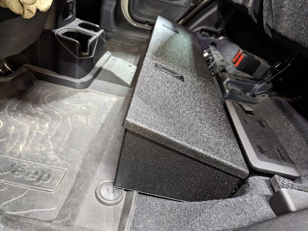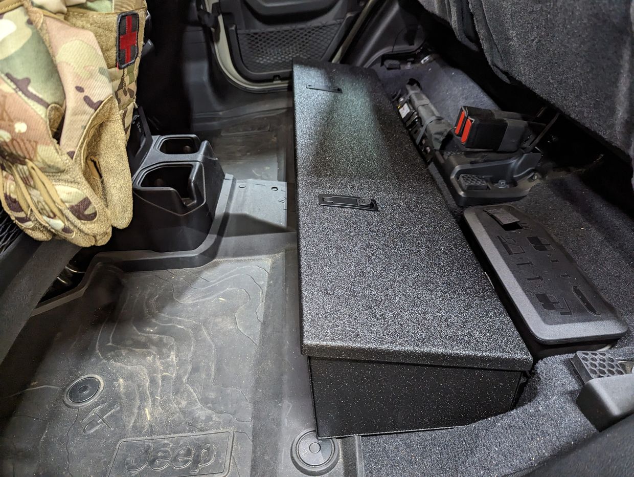 The RockMan Fabrication Underseat Storage Box is designed to fit under the back seat of the Jeep Gladiator JT. Our box mounts to your Jeep using existing factory-threaded holes for easy NO-DRILL installation!